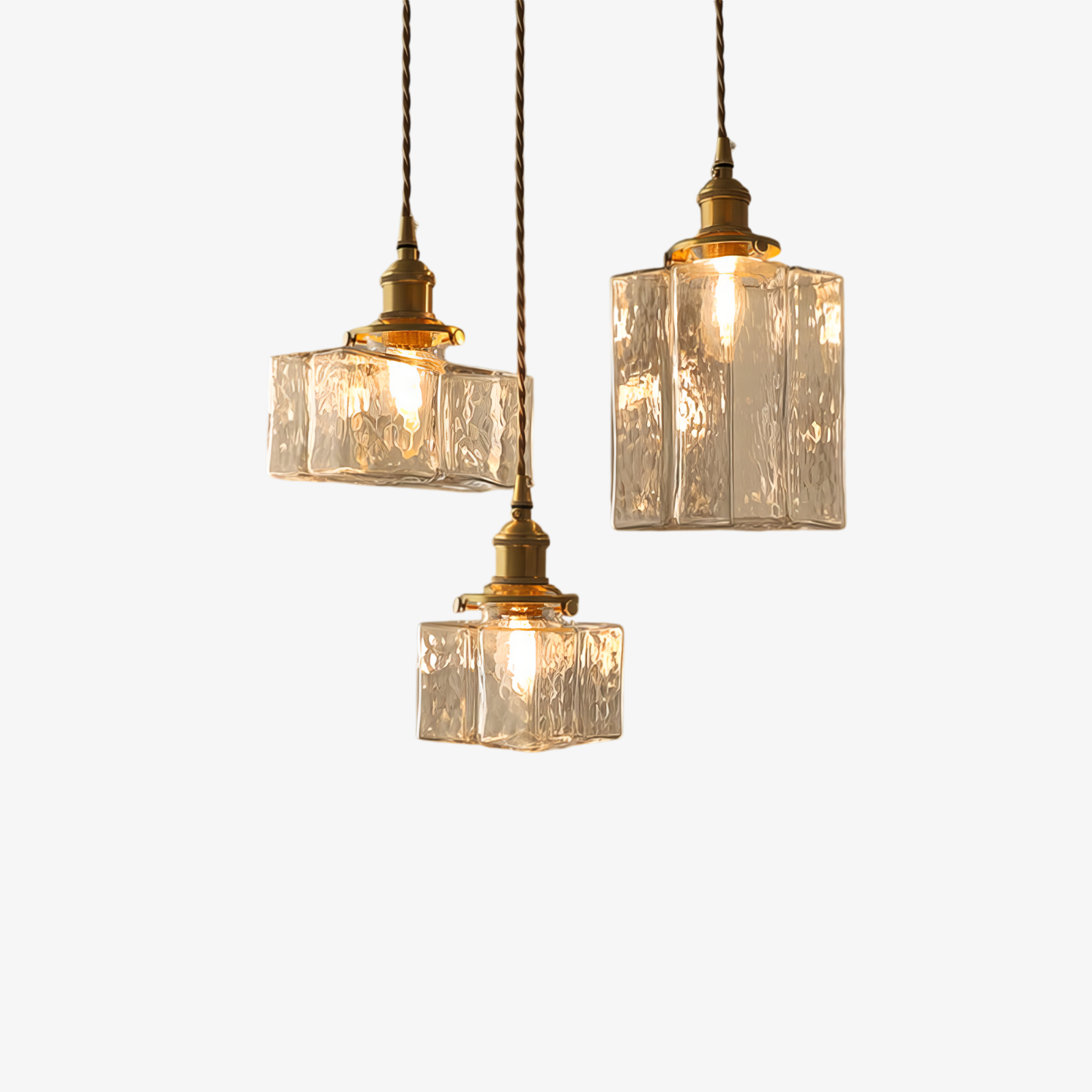 Add a splash of vintage charm to your home with the Savoy Glass Pendant, featuring unique hand-textured shades that cast a warm, inviting glow. Its elegant antique brass hardware and twisted cord bring a touch of playful sophistication to any room.